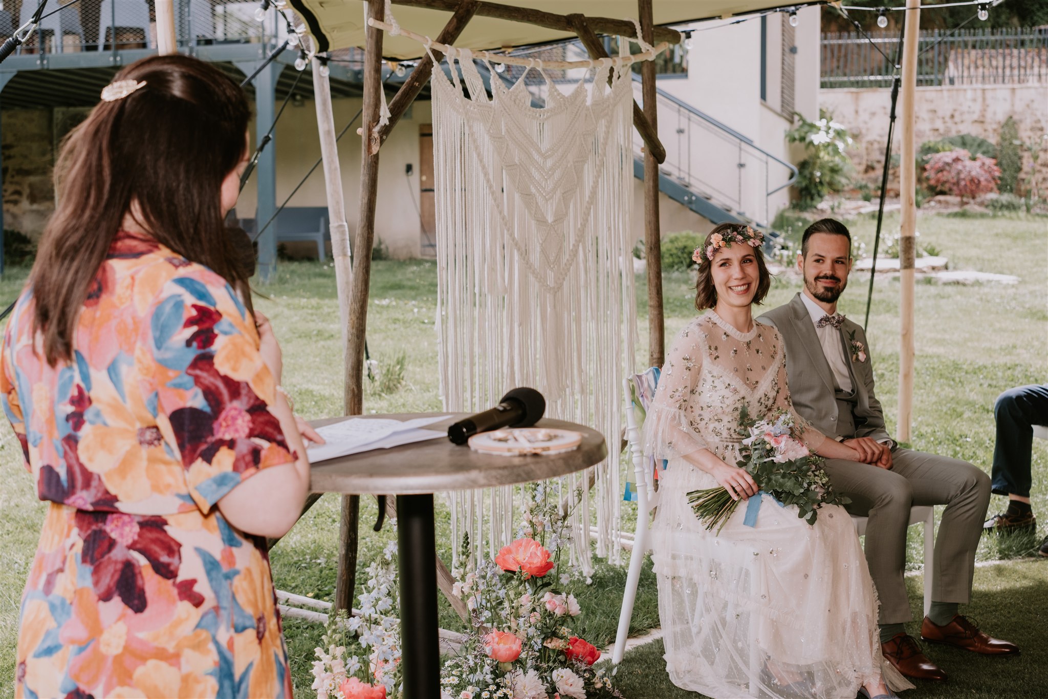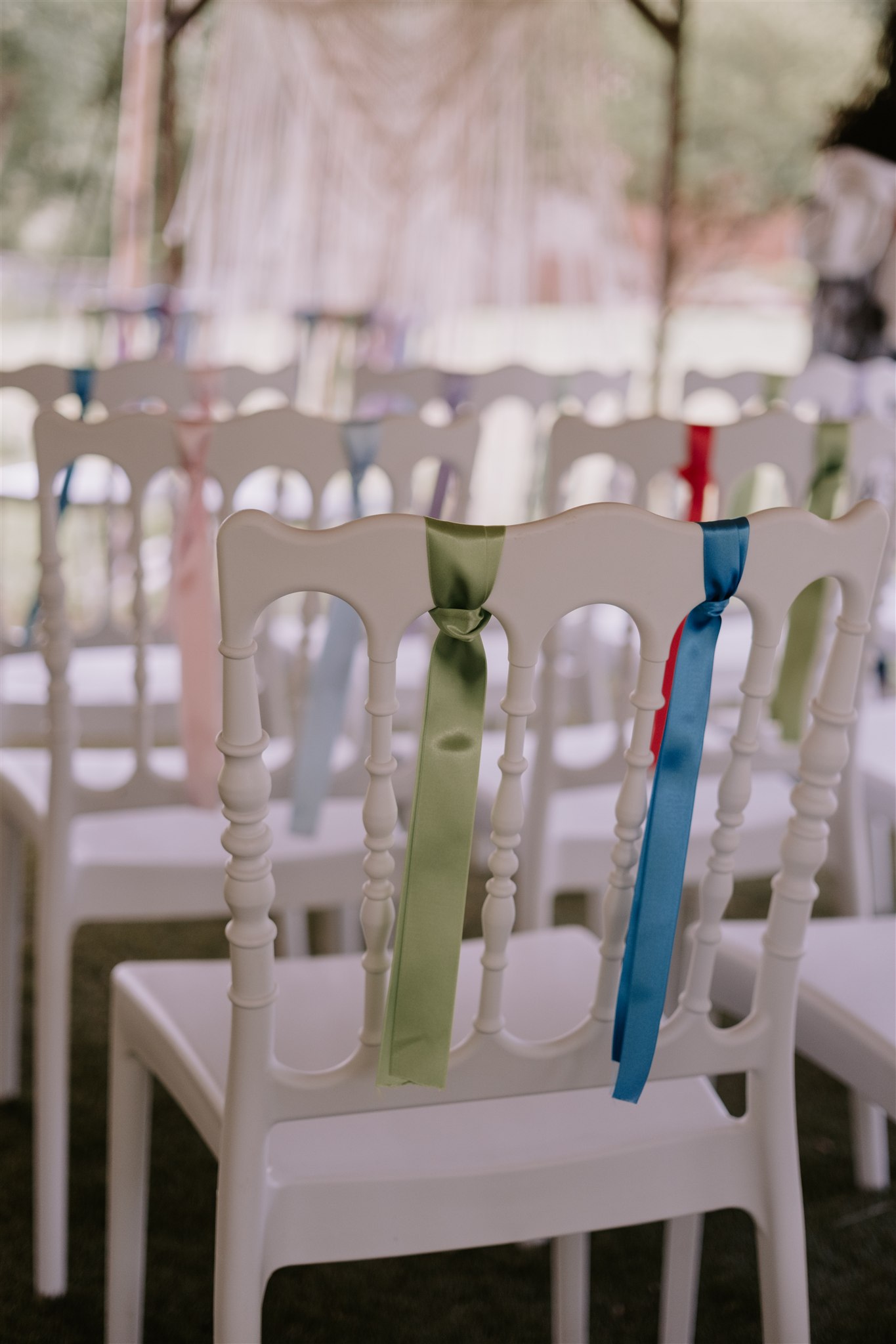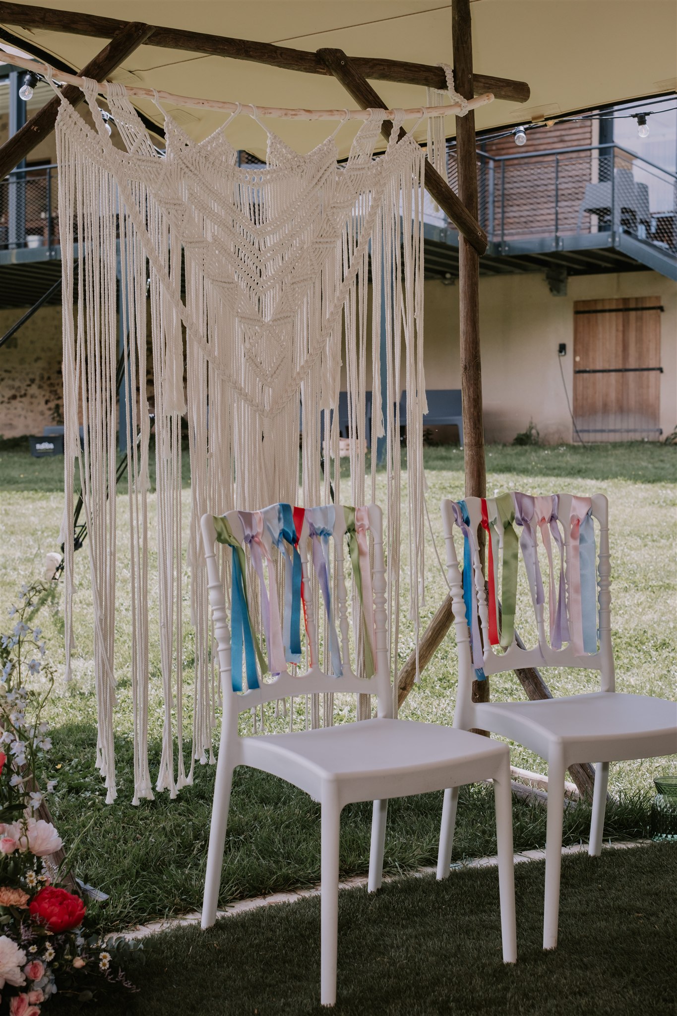 L’arche des mariés arborait une superbe création en macramé, faite main par la mariée et ses amis. Pour ajouter un peu de couleur, les mariés avaient également choisi d’accrocher des rubans sur le dossier des chaises. Une façon parfaite de personnaliser leur cérémonie !