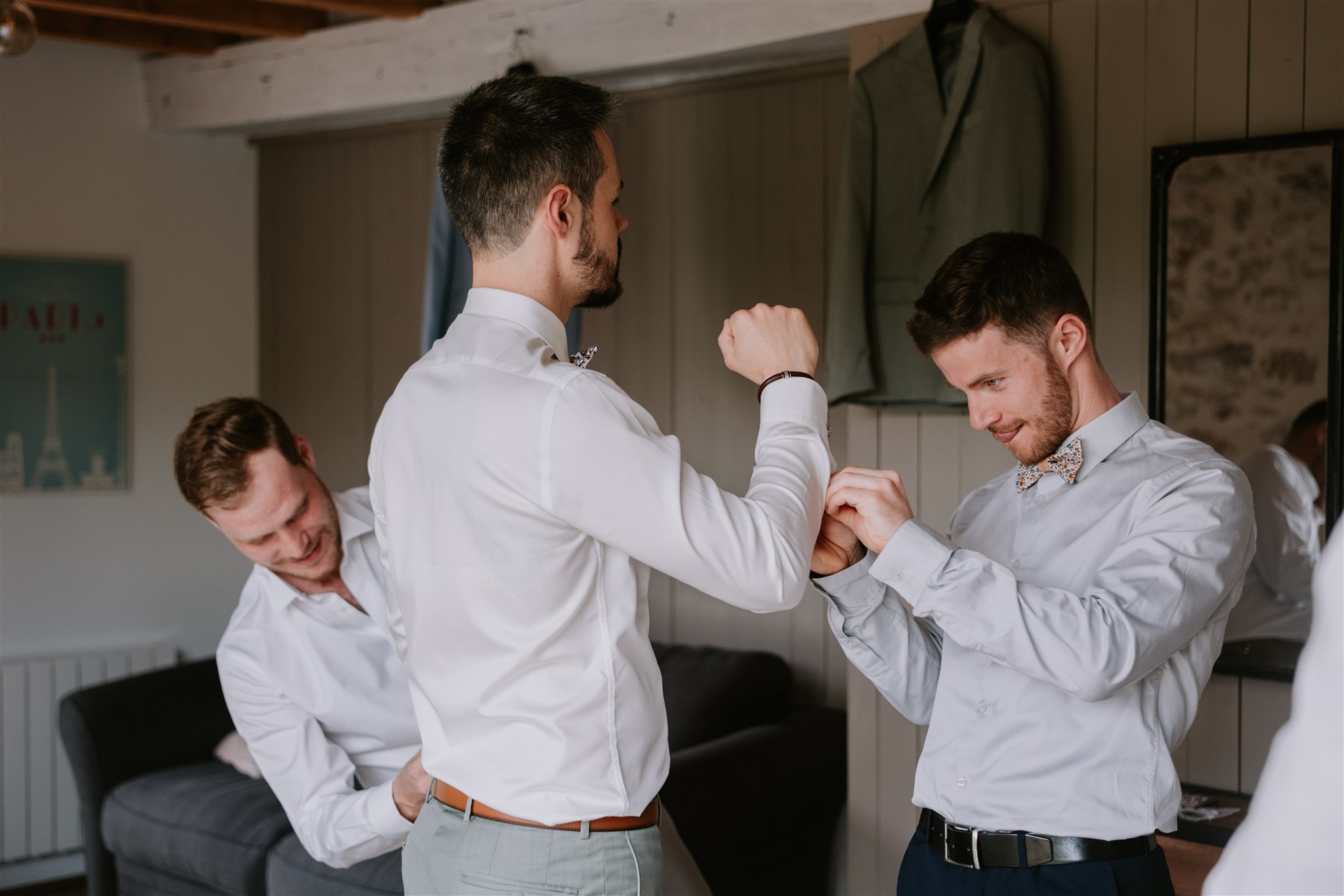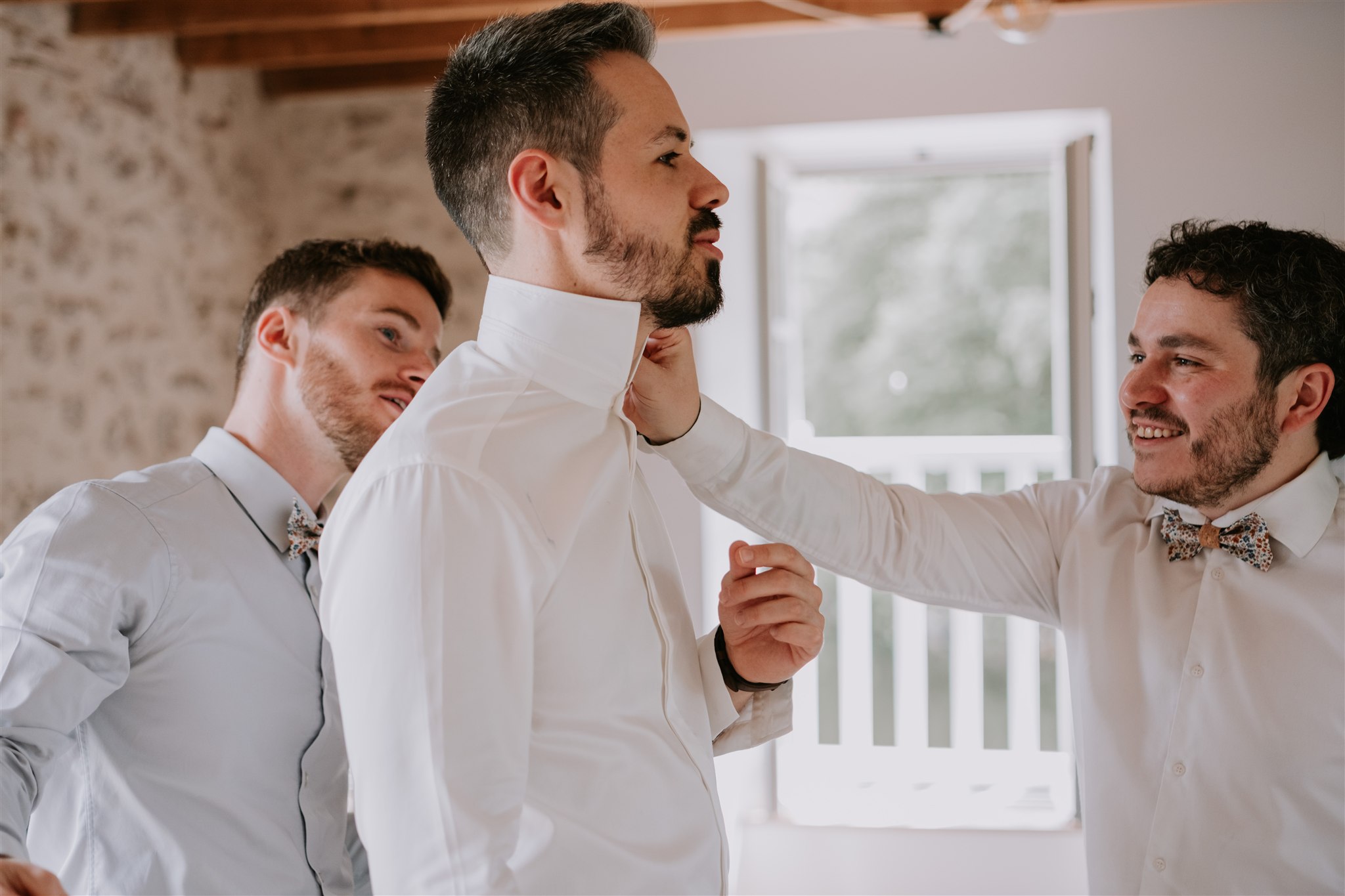 Le marié du jour, Clem (et oui, pas si simple, j’espère que vous suivez !), s’est préparé sur le palier du premier étage du Moulin de Grenon. Si le lieu est un peu moins grandiose que la suite nuptiale, il n’en est pas moins très lumineux, ce qui est pour moi le plus important.