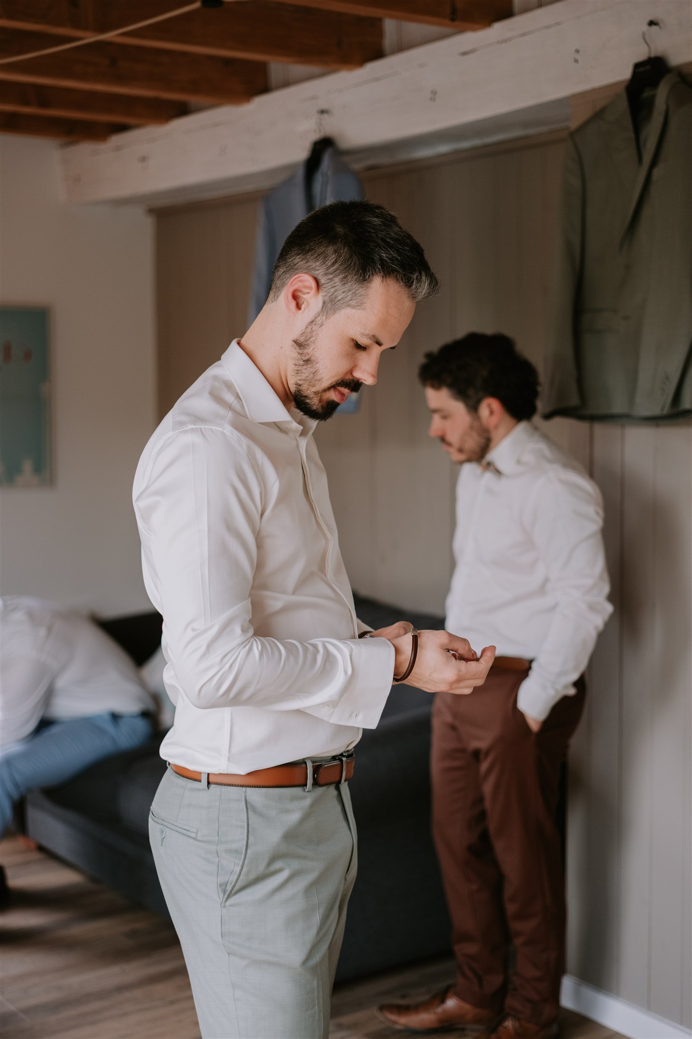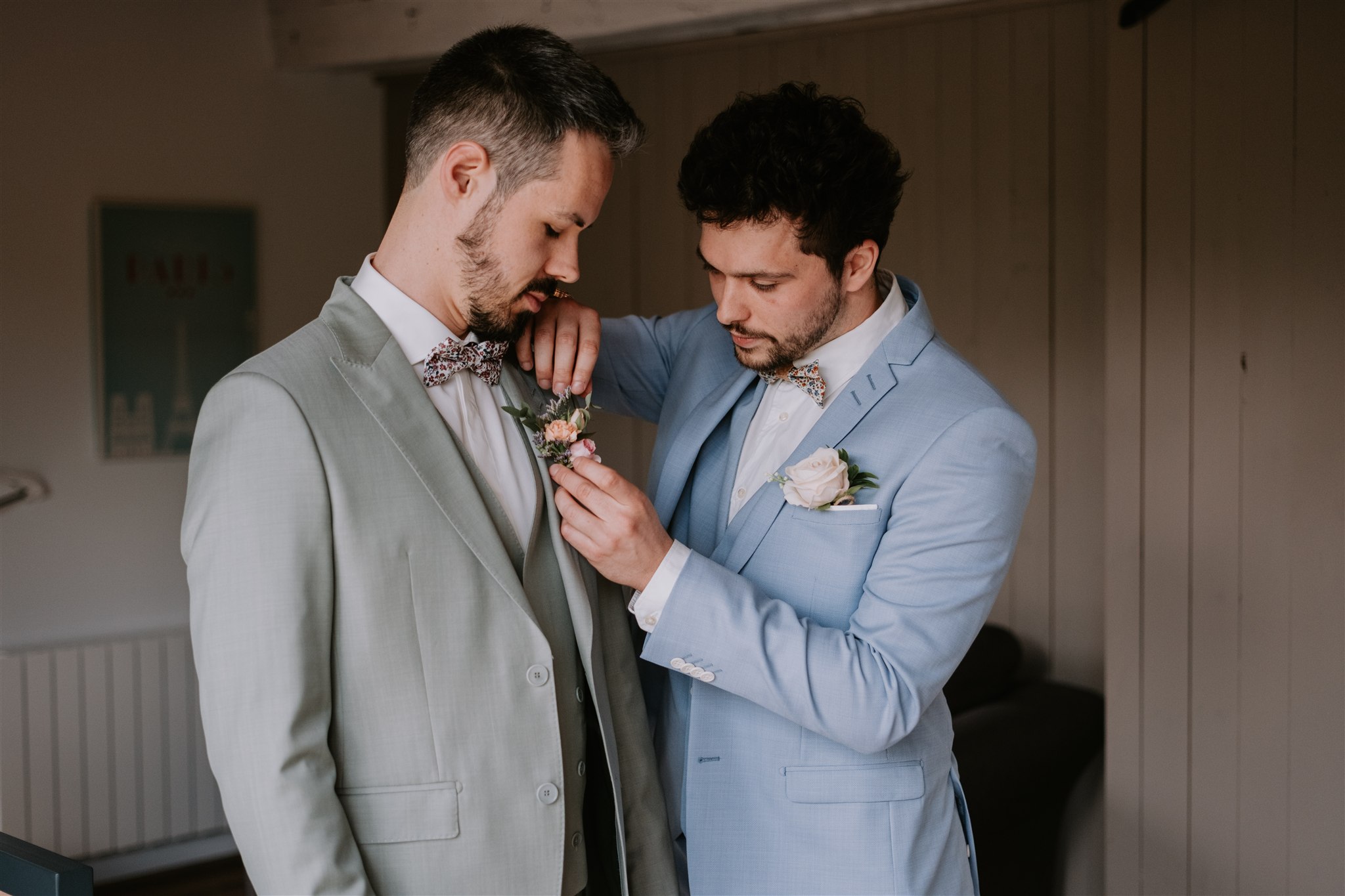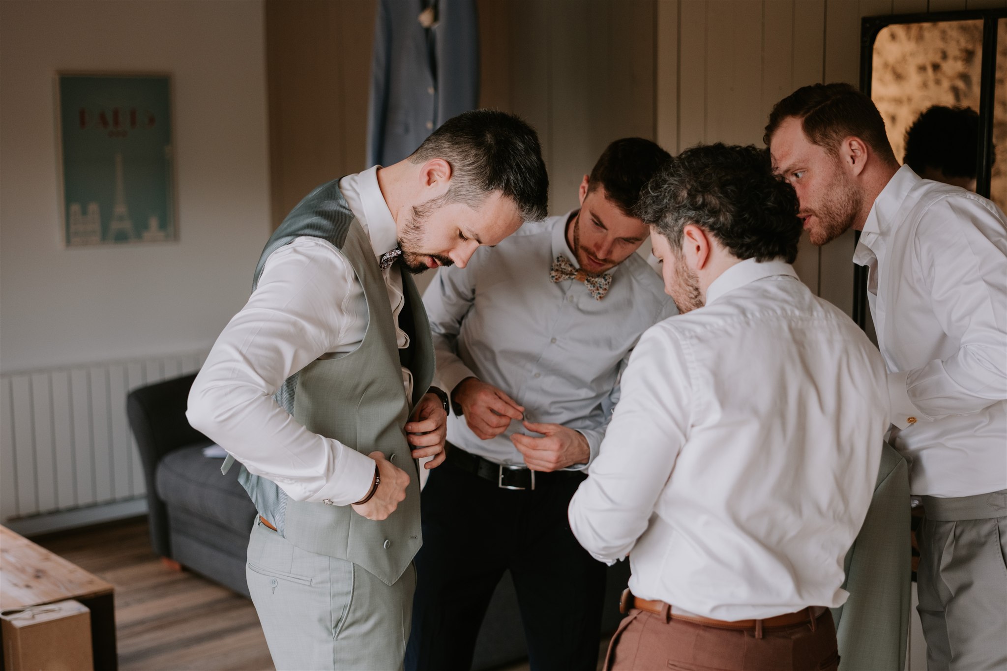 Au milieu de cette ambiance détendue, et probablement pour ajouter un peu d’inattendu, un bouton du gilet du marié a décidé de sauter au moment de l’enfilage ! Mais heureusement, une maman est généralement préparée à toutes les situations imprévues : la maman de la mariée est arrivée pour porter secours au marié, avec un petit kit de couture.