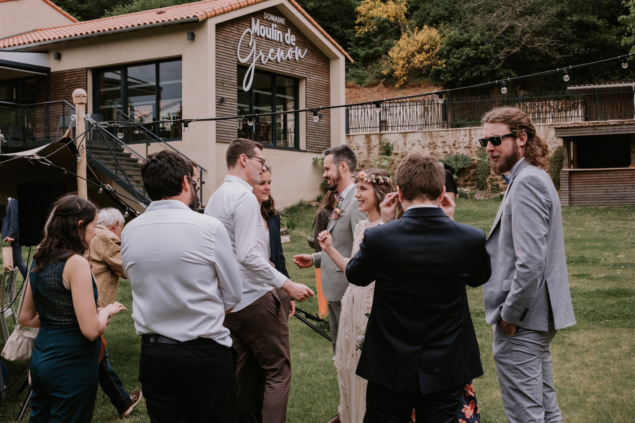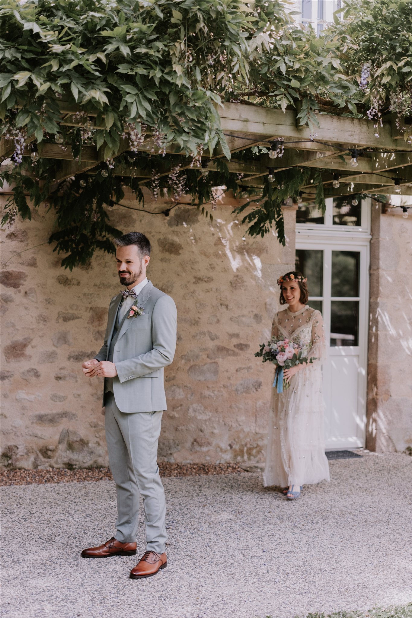 Le Moulin de Grenon propose plusieurs espaces bien distincts les uns des autres, et nous avons utilisé cette configuration à notre avantage. Pendant que les invités arrivaient tranquillement et prenaient place pour la cérémonie laïque, les mariés ont pu se retrouver dans le jardin du gîte.