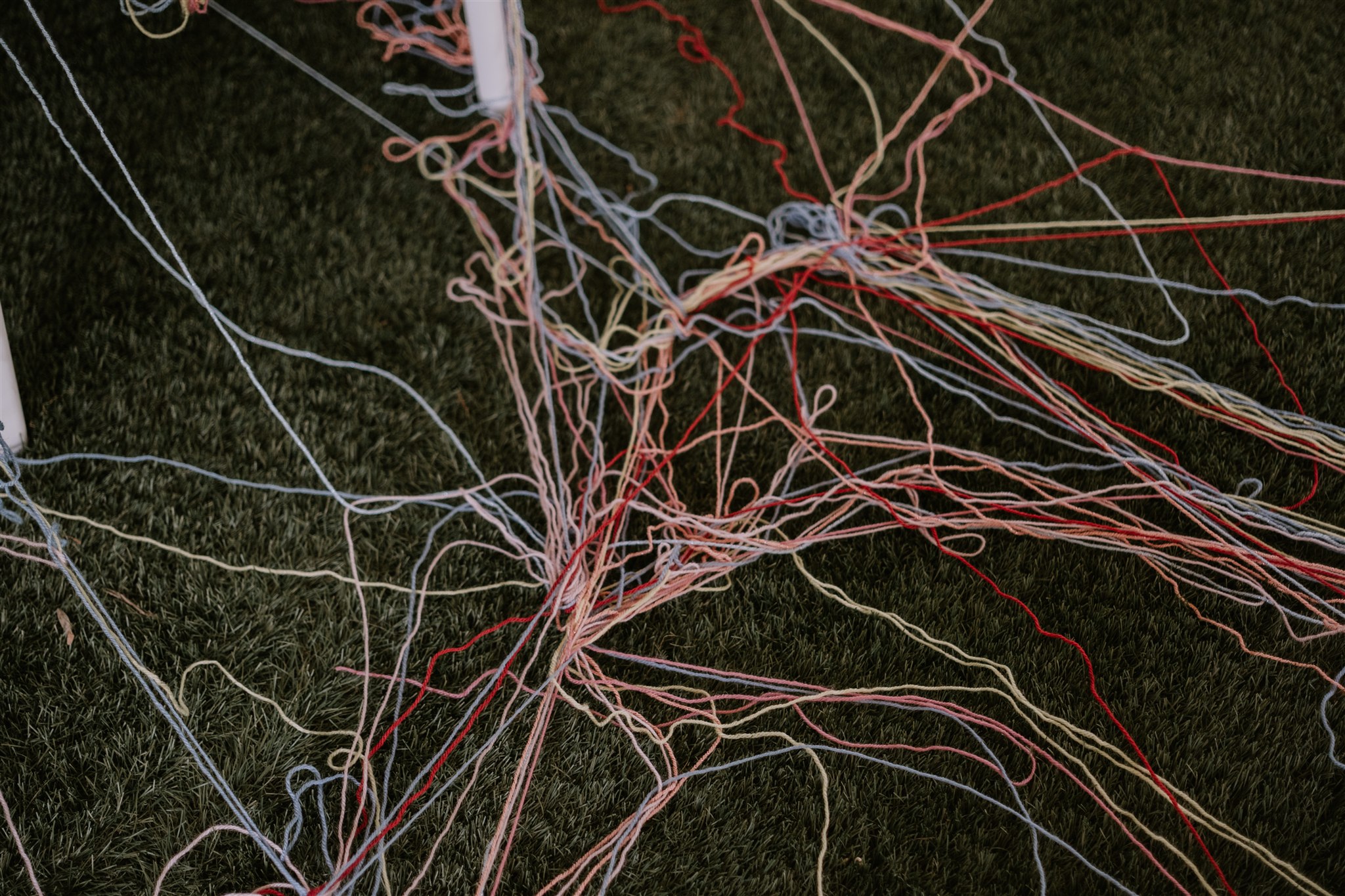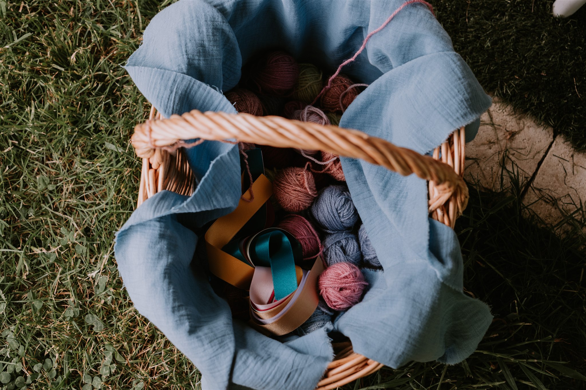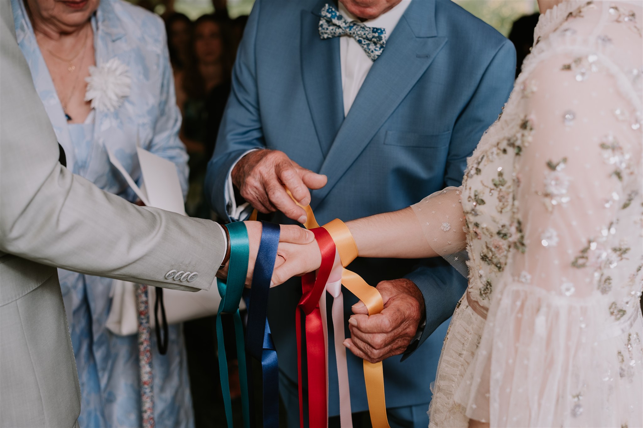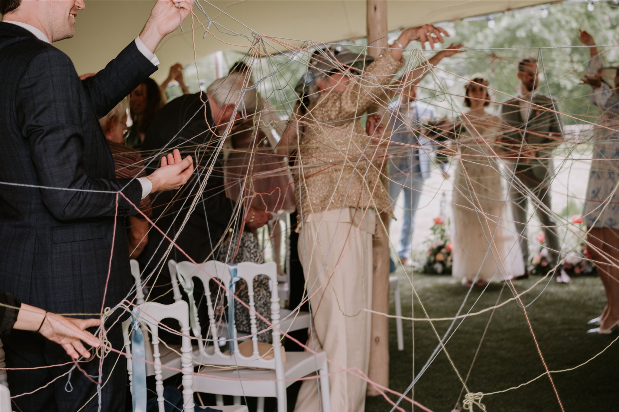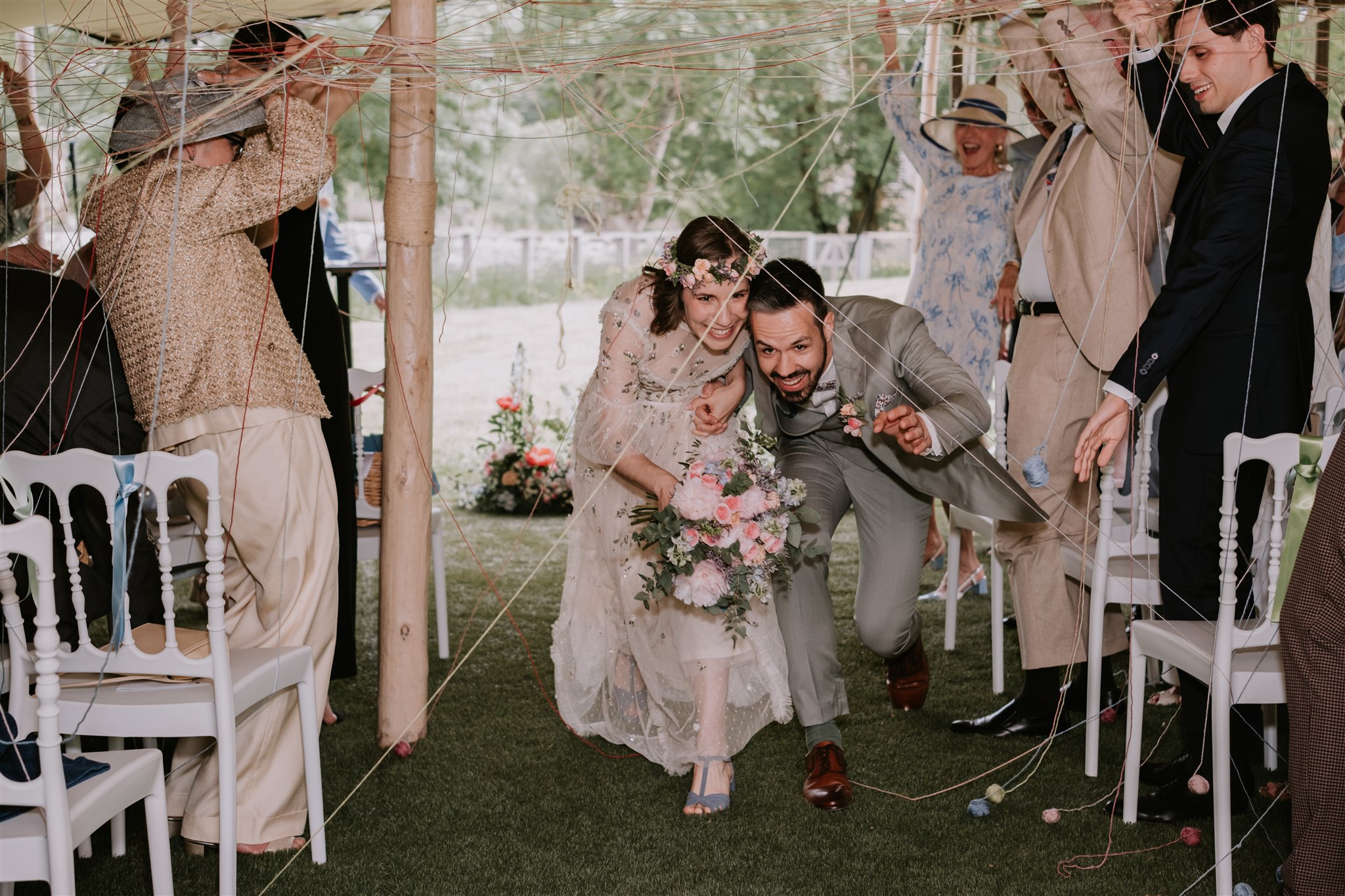 Pour la sortie de la cérémonie, après des discours qui ont fait rire mais aussi verser quelques larmes, les mariés ont choisi d’opter pour le rituel des pelotes. Ce moment a donné lieu à l’une de mes photos favorites de cet article. Le principe est simple : des pelotes sont distribuées aux invités, qui doivent se les lancer de chaque côté de l’allée centrale afin de créer un tissage, sous lequel les mariés passent ensuite. L’idée est de représenter les liens qui unissent les mariés et les proches avec qui ils ont partagé ce moment si particulier qu’est leur cérémonie de mariage.