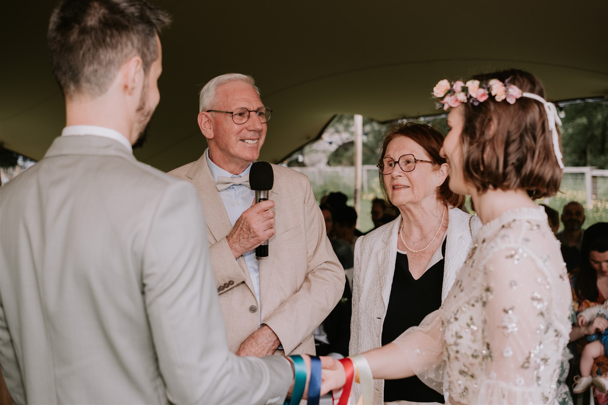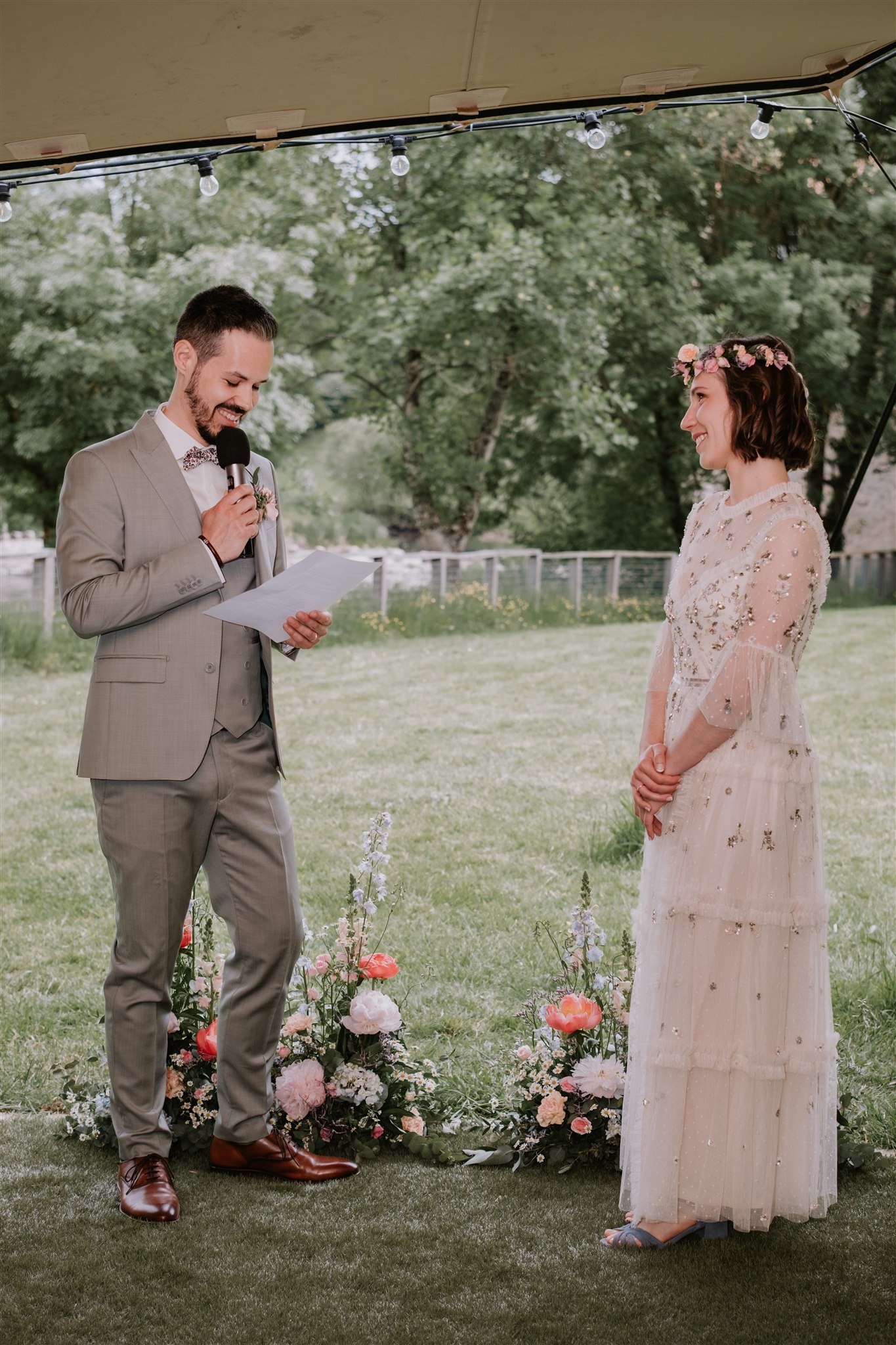 La cérémonie laïque s’est tenue sous la grande tente blanche présente sur le domaine du Moulin de Grenon. Elle nous protégeait du soleil… et de l’orage que nous savions déjà en approche.