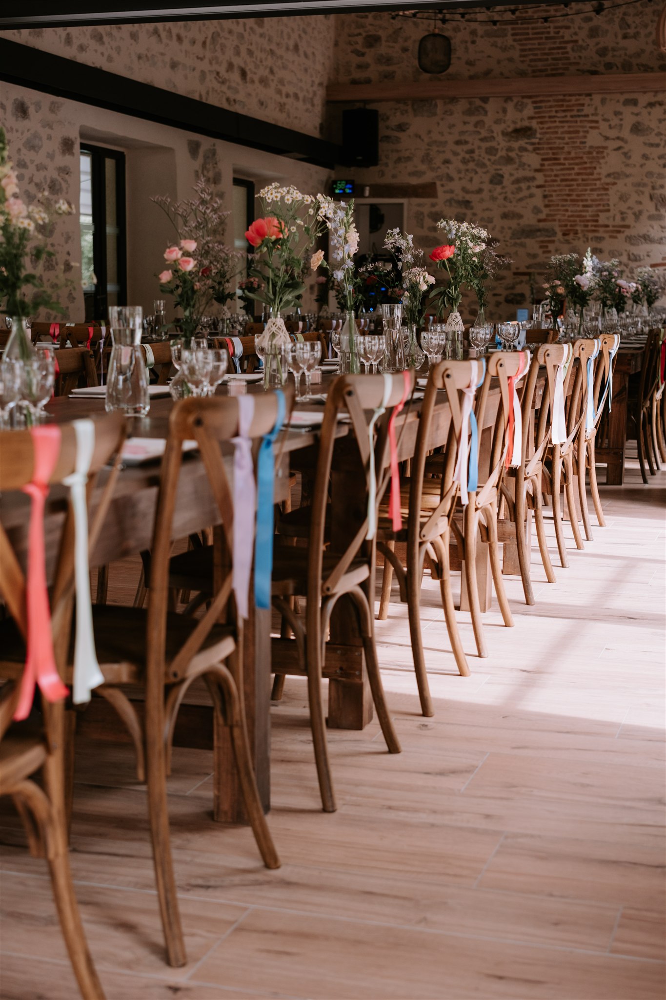 Après la séance couple, il était temps de passer au repas dans la grande salle du Moulin de Grenon. Les mariés avaient choisi une décoration sobre mais colorée, qui laissait à chaque élément l’espace pour briller : les murs en pierre, les grandes tablées en bois, les vases décorés de macramé fait main, les fleurs, et, comme un fil conducteur, les rubans colorés sur les dossiers de chaise.